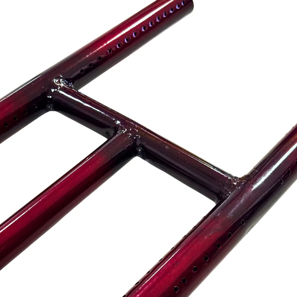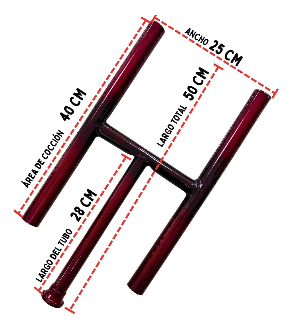 Quemador tipo H económico para planchas y comales. Medida útil de 40 cm para mayor área de calentado, ideal para uso doméstico o comercial ligero. Acabado pintado en rojo y diseño que distribuye el calor de manera uniforme.