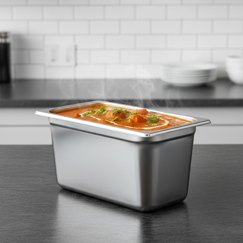 Inserto gastronómico AROL 1/3 GN x 20 cm con tapa, fabricado en acero inoxidable tipo 201 calibre 24, ideal para cocinas industriales, buffets y servicios de catering. Su profundidad permite almacenar alimentos en mayor volumen, manteniendo higiene y durabilidad gracias a su certificación NSF para contacto alimentario.