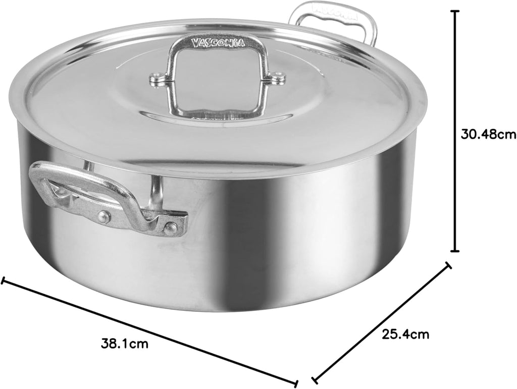 La Budinera Vasconia PRO de 34 cm ofrece una capacidad de 10 litros, ideal para cocinas profesionales y uso intensivo. Fabricada en aluminio acorazado con acabado espejo satinado, garantiza una cocción uniforme y rápida. Sus asas remachadas brindan seguridad, y cuenta con certificación NSF.